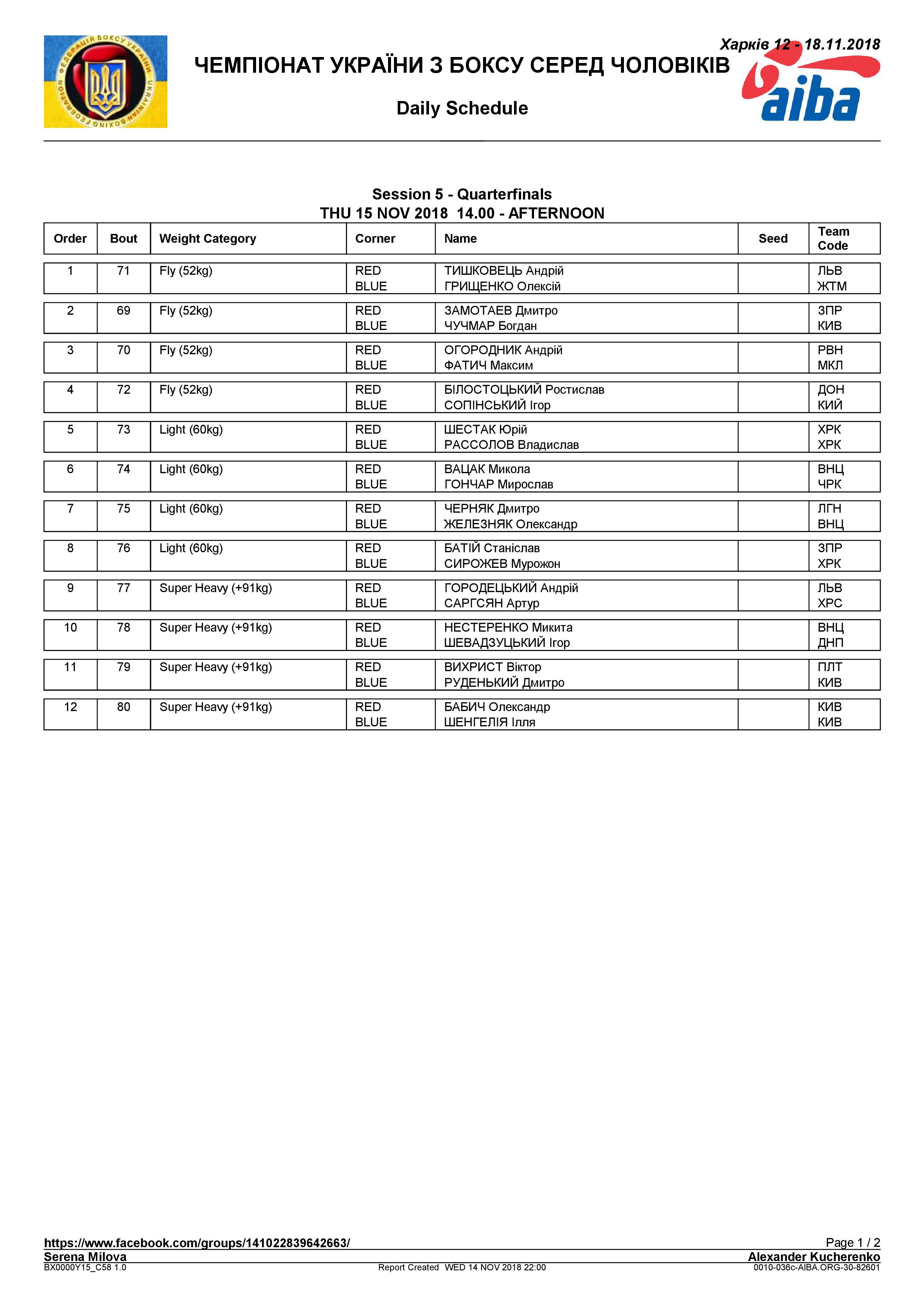 Состав пар на 15.11.2018 Чемпионат Украины среди мужчин Харьков 2018